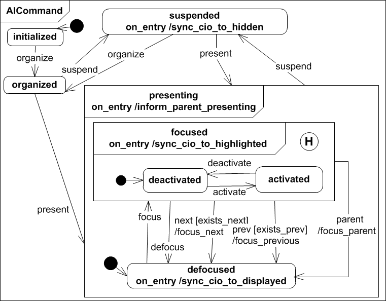 The Abstract Interactor Command details the AIIN/AIO behavior for the focused state. If an AICommand is focused it is initially deactivated. A command can be issued by the user setting it to activated. The command is activated until the user deactivates it again. An AICommand is derived from the AIIN class since it describes an input that can only be triggered by the user.