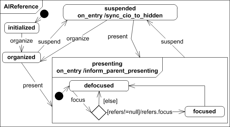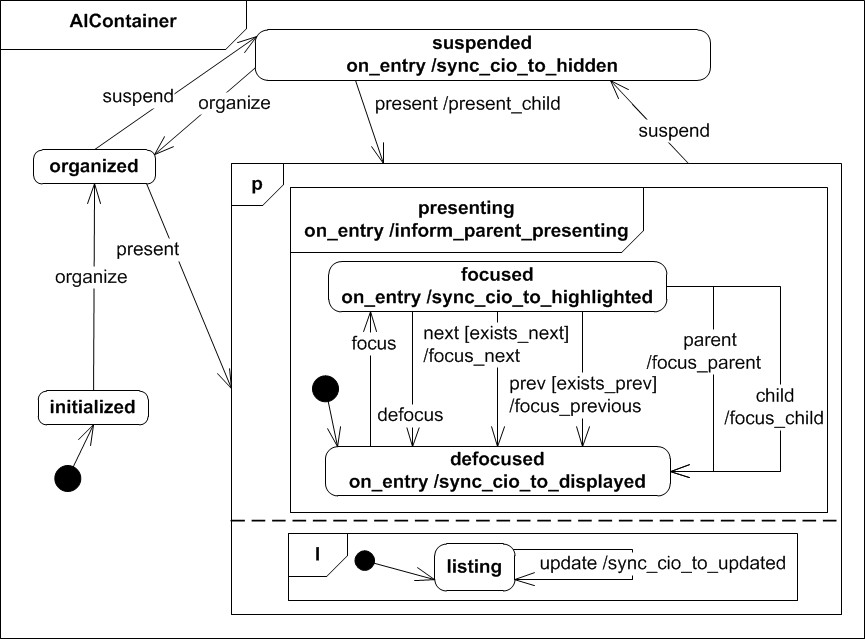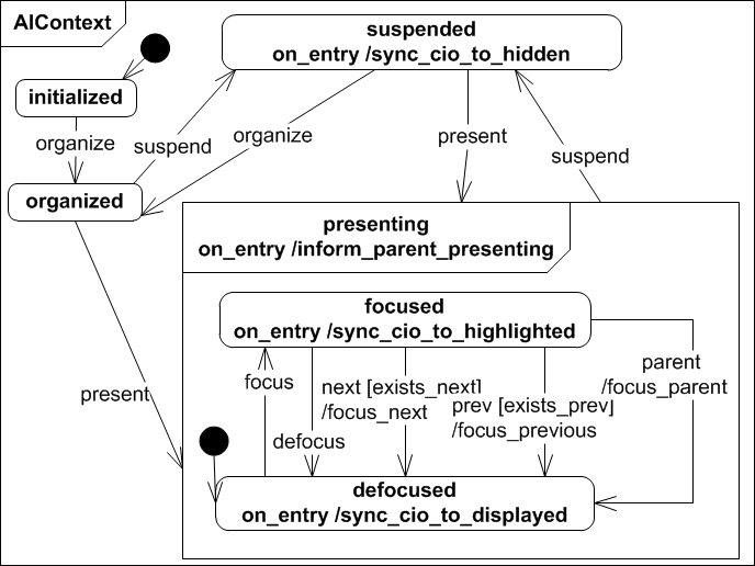 After an AIO has been initialized it can be presenting, after it has been successfully organized. To calculate the AIO organisation, a basic navigation scheme is established for all AIOs that are presented together on a certain time in a user interface dialog. An AIO that is presenting can be removed from the user interface by suspending it to ''suspended'. Therafter it can be presenting again.