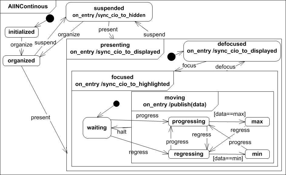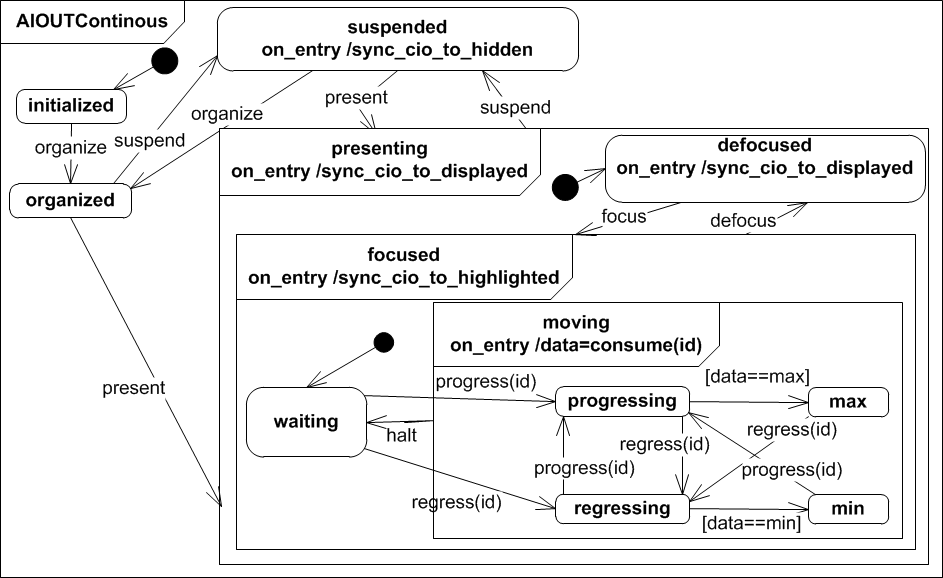 The Abstract Interactor Out Continous sums up all continous output elements, like graphical progress bars for graphical interaction or to express changes of the tone pitch for sound output for instance.The element is originally set to waiting and it's kept that way until it receives a progress or regress event. When that happens it goes to state progressing or regressing respectively. It returns to waiting when it receives the halt event.