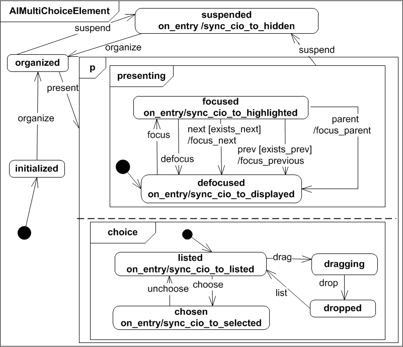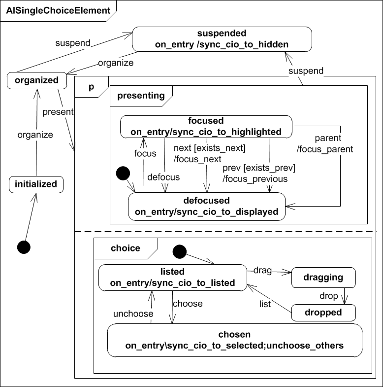 The Abstract Interactor Choice Element extends the AIO presenting state to allow elements to be dragged and dropped. So if a choice element is focused and gets the drag event it is checked if it's unchosen. In case that's true it issues a choose event for itself and then goes to dragging. In case the check returns false it goes directly to dragging. When it gets the drop event it's defocused again.