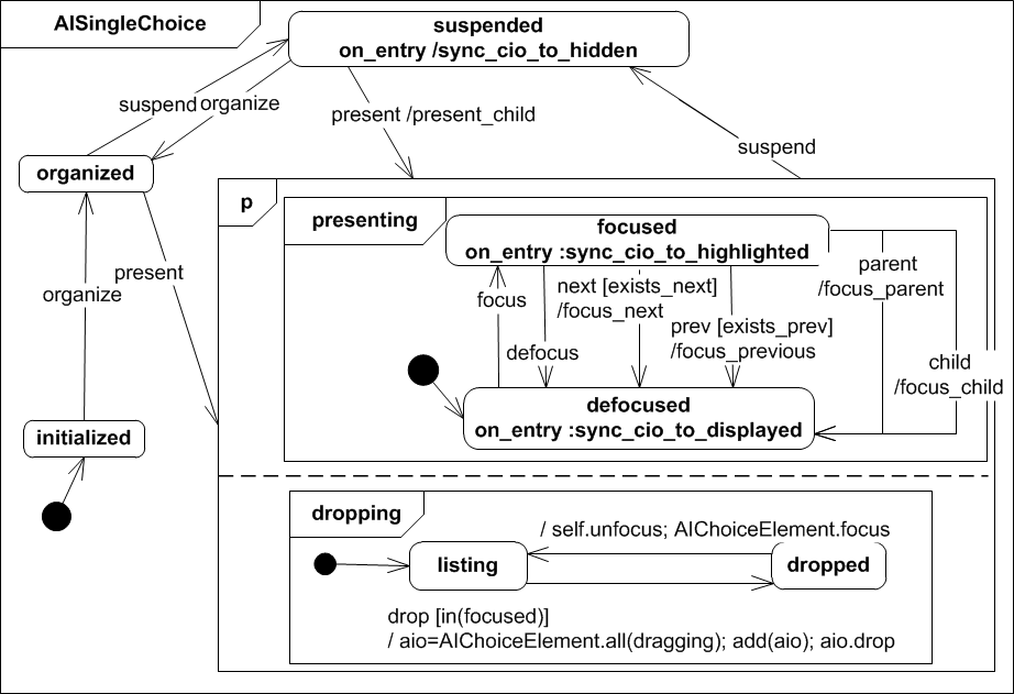 The Abstract Interactor Single Choice Element extends the AIChoiceElement presenting state in the sense that it adds selection to run in parallel with the presenting. A AISIngleChoiceElement is originally unchosen and if it gets the choose event (and it's focused) all other elements get unchosen. This ensures that only one element is chosen at a time.
