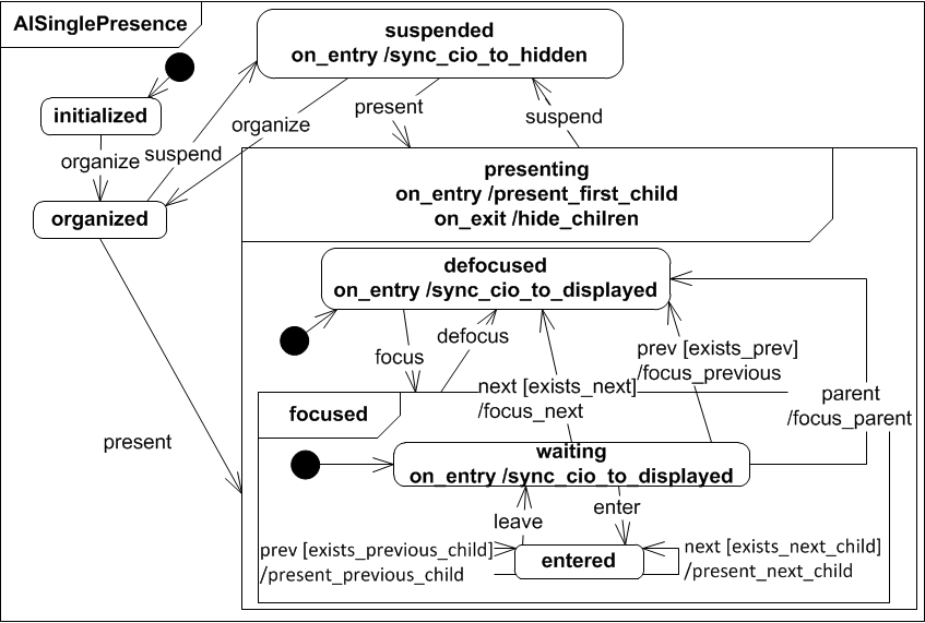 The Abstract Interactor Single Presence extends the AIContainer, but only presents one of it's children at a time to the user. When entering state presenting it must be checked whether or not there is an active child and if not the first page gets presented. The interactor is initially defocused, so that to be available for use it must be the currently focused object. When focused, it stays on state waiting until it receives the enter event. While on state waiting the interactor can receive a next, prev (previous) or parent event to enable navigation between interactors. The navigation within the interactor is possible by sending the next or prev events when on the entered state. This will suspend the active child and select the desired one.