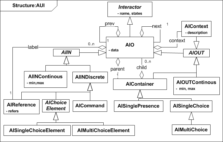 Grouping of interactors is handled by abstract interactor containers (AIContainer). AIContainers can be specialized to realize single (AISingleChoice) or multiple choices (AIMultiChoice) and are derived from the discrete output interactor. A discrete output interactor can be explicitly associated with every AIO, which we call AIContext. The AIContext is used to add contextual information that helps the user to control the interface or to understand the interface interactor. This could be, for instance, a tooltip, a picture or a sound file.