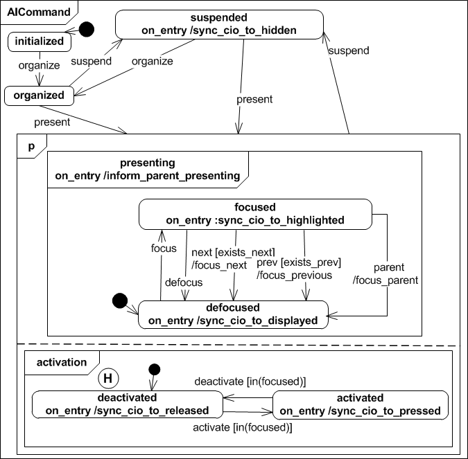 If the Abstract Interactor Command (AICommand) receives a present event, it enables to activate a command, which could end up using a mapping as a backend funcion call or a manipulation of another interactor for instance. The AICommand is initially deactivated and gets activated only if it is in state focus as well. The command activation state is persistent even if the interactor gets suspended. An AICommand is derived from the AIIN class since it describes an input that can only be triggered by the user.