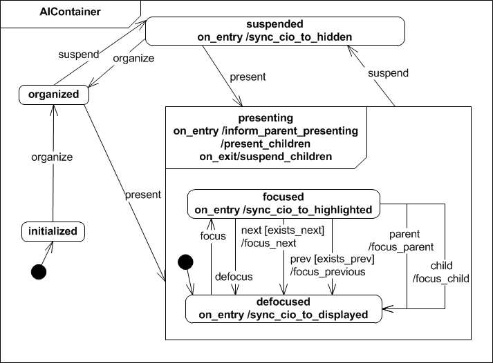 The Abstract Interactor Container (AIContainer) allows grouping of AIOs. Each AIContainer must have one parental AIContainer (with the exception of the root AIContainer) and stores references to all AIOs that it contains. The grouping of AIOs is considered an output mode. The AIContainer details the navigation options of the AIO's presenting state. Besides next,prev, focus, and defocus events the AIContainer supports navigation to parental AIContainers as well as setting a focus to the first child AIO by the child event.