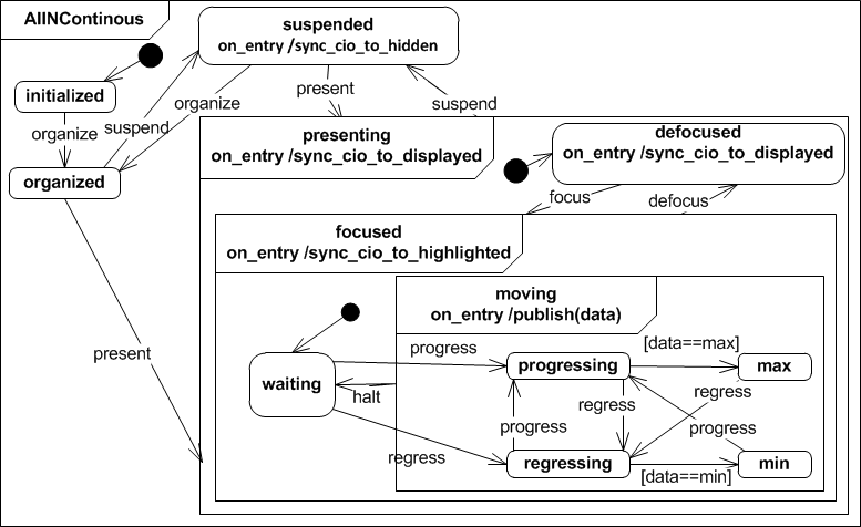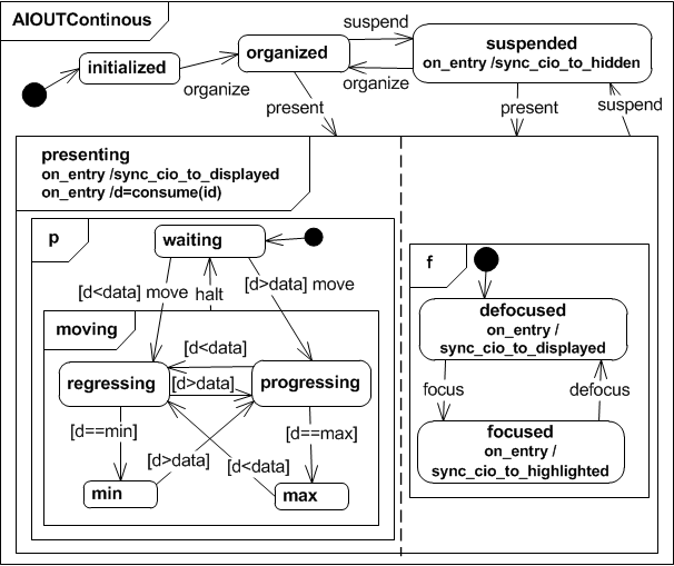 The Abstract Interactor In Continuous sums up all continuous input elements, like graphical sliders and scroll bars, physical knobs or gestures that represent distances. If the interactor is in state presenting it is initally set to waiting and it's kept that way until it receives a progress or regress event. When that happens it goes to state progressing or regressing respectively. It returns to waiting as soon as it receives a halt event. The AIINContinuous interactor class can store a minimum min and maximum max value for data. While regressing or progressing the produced data is checked for these boundaries and the inetractor changes to min or max in case a boundary is met.