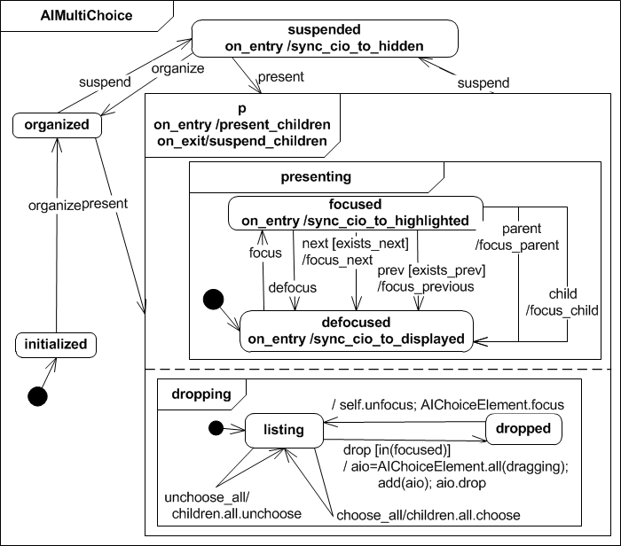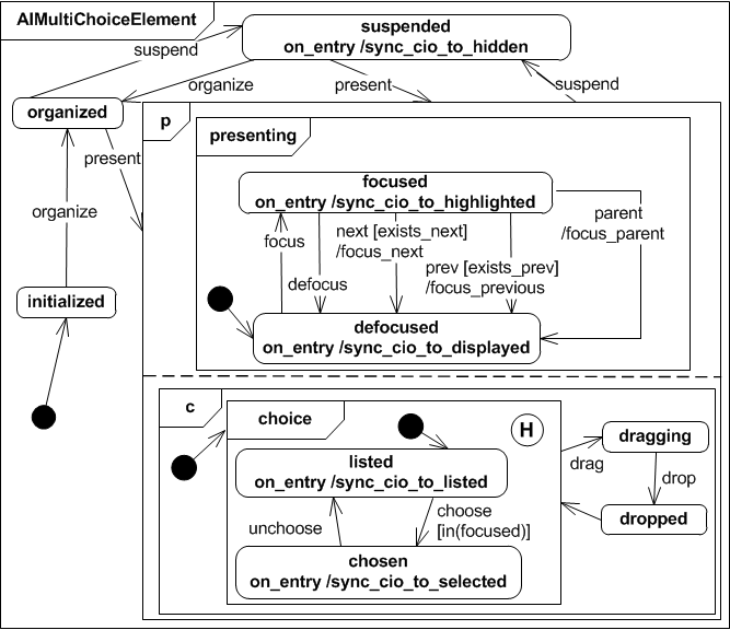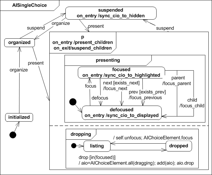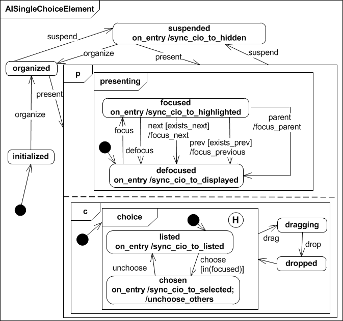 The Abstract Interactor Single Choice Element extends the AIChoiceElement presenting state in the sense that it adds a choice run in parallel with the presenting super state. A AISIngleChoiceElement is initially listed and if it recieves the choose event (and it's focused) all other elements get unchosen. This ensures that only one element is chosen at a time. The choice state is stored persistently even if the interactor gets suspended.