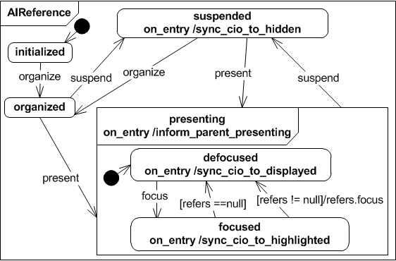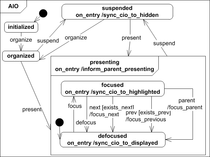 After an AIO has been initialized it can be presenting, after it has been successfully organized. To calculate the AIO organisation, a basic navigation scheme is established for all AIOs that are presented together on a certain time in a user interface dialog. An AIO that is presenting can be removed from the user interface by suspending it to ''suspended'. Therafter it can be presenting or organized again, if the navigation scheme needs to be updated.