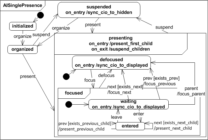 The Abstract Interactor Single Presence (AISinglePresence) extends the AIContainer. Different to the AIContainer that presents all its children interactors at the same time, the AISinglePresence only presents one of it's children at a time to the user. When entering state presenting the interactor checks whether or not there is an active child and if not the first child gets presented (present_first_child). The interactor is initially defocused, so that to be available for use it must be the currently focused object. When focused, it stays on state waiting until it receives the enter event. While on state waiting the interactor can receive a next or prev (previous) or parent event for interface navigation. When the interactor is entered the navigation events next and prev are used to navigate within the interactor, between it's children. A suspend event suspends all children of the interactor (suspend_children) and saves the currently active child so that it can be recovered if the same AISinglePresence interactor is presented again.