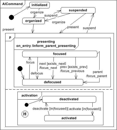 If the Abstract Interactor Command (AICommand) receives a present event, it enables to activate a command, which could end up using a mapping as a backend funcion call or a manipulation of another interactor for instance. The AICommand is initially deactivated and gets activated only if it is in state focus as well. The command activation state is persistent even if the interactor gets suspended. An AICommand is derived from the AIIN class since it describes an input that can only be triggered by the user.