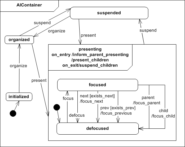 The Abstract Interactor Container (AIContainer) allows grouping of AIOs. Each AIContainer must have one parental AIContainer (with the exception of the root AIContainer) and stores references to all AIOs that it contains. The grouping of AIOs is considered an output mode. The AIContainer details the navigation options of the AIO's presenting state. Besides next,prev, focus, and defocus events the AIContainer supports navigation to parental AIContainers as well as setting a focus to the first child AIO by the child event.