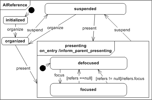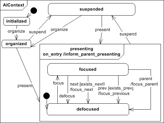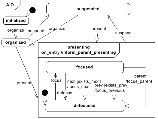 After an AIO has been initialized it can be presenting, after it has been successfully organized. To calculate the AIO organisation, a basic navigation scheme is established for all AIOs that are presented together on a certain time in a user interface dialog. An AIO that is presenting can be removed from the user interface by suspending it to ''suspended'. Therafter it can be presenting or organized again, if the navigation scheme needs to be updated.
