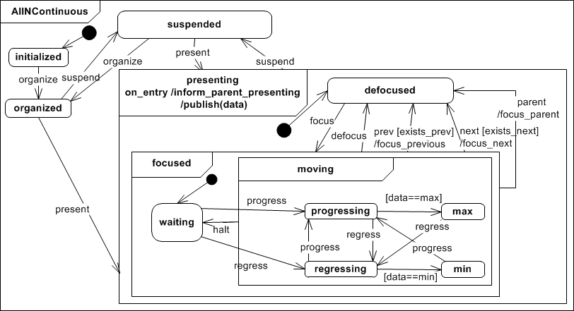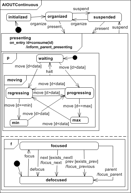 The Abstract Interactor In Continuous sums up all continuous input elements, like graphical sliders and scroll bars, physical knobs or gestures that represent distances. If the interactor is in state presenting it is initally set to waiting and it's kept that way until it receives a progress or regress event. When that happens it goes to state progressing or regressing respectively. It returns to waiting as soon as it receives a halt event. The AIINContinuous interactor class can store a minimum min and maximum max value for data. While regressing or progressing the produced data is checked for these boundaries and the inetractor changes to min or max in case a boundary is met.
