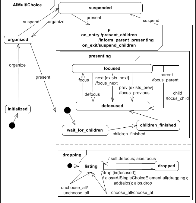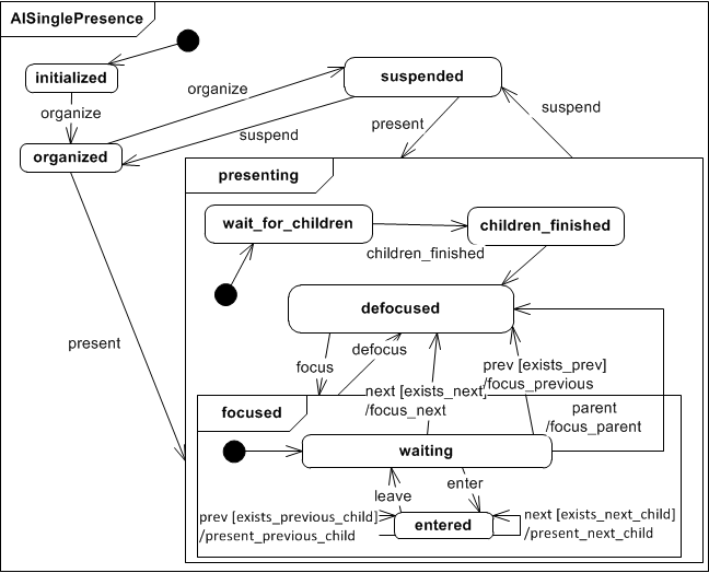 The Abstract Interactor Single Presence (AISinglePresence) extends the AIContainer. Different to the AIContainer that presents all its children interactors at the same time, the AISinglePresence only presents one of it's children at a time to the user. When entering state presenting the interactor checks whether or not there is an active child and if not the first child gets presented (present_first_child). The interactor is initially defocused, so that to be available for use it must be the currently focused object. When focused, it stays on state waiting until it receives the enter event. While on state waiting the interactor can receive a next or prev (previous) or parent event for interface navigation. When the interactor is entered the navigation events next and prev are used to navigate within the interactor, between it's children. A suspend event suspends all children of the interactor (suspend_children) and saves the currently active child so that it can be recovered if the same AISinglePresence interactor is presented again.
