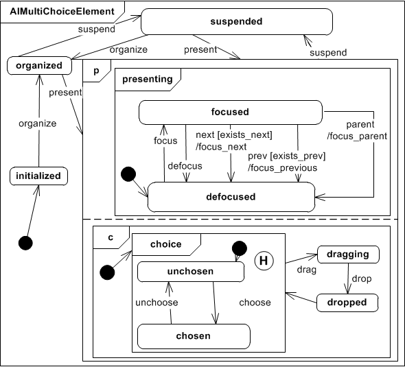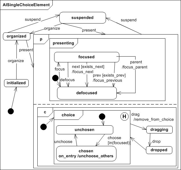 The Abstract Interactor Single Choice Element extends the AIChoiceElement presenting state in the sense that it adds a choice run in parallel with the presenting super state. A AISIngleChoiceElement is initially listed and if it recieves the choose event (and it's focused) all other elements get unchosen. This ensures that only one element is chosen at a time. The choice state is stored persistently even if the interactor gets suspended.